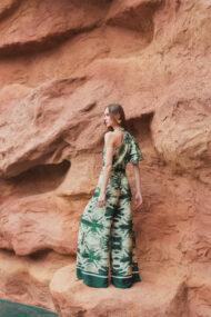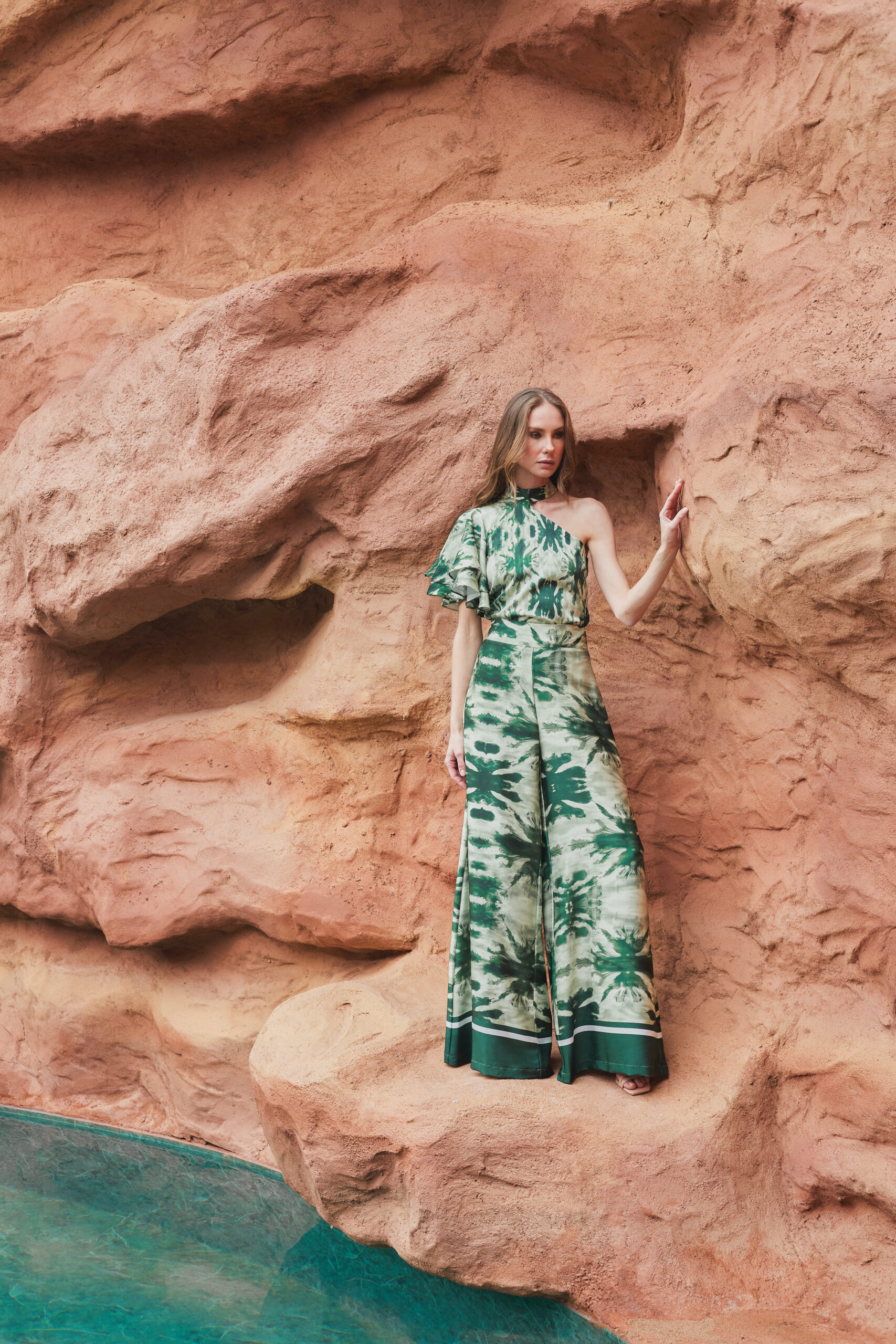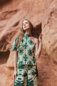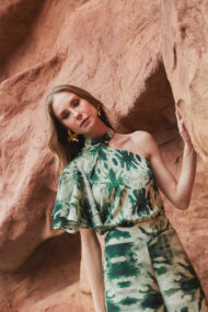 El set Cayetana es una apuesta infalible para lucir con estilo. La blusa presenta un cuello halter con escote medio tipo beso y manga con volantes redondeados que le aportan un toque de elegancia única.